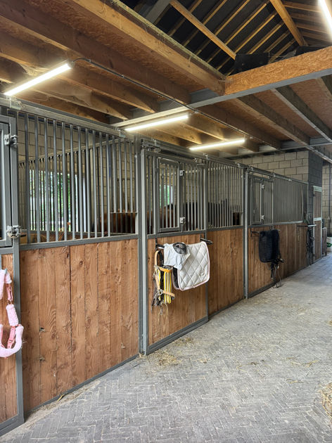 De woning is ideaal voor paardenliefhebbers. De goed onderhouden paardenstal, met een afmeting van 6 meter breed en 13,6 meter lang, inclusief de eikenoverkapping, beschikt over drie ruime boxen met aansluitende paddocks, een zadelkamer en een ruime gang. Een grote zolder biedt extra opslagruimte. Direct aansluitend zijn de uitlooppadocks gelegen, en het terrein beschikt over twee weides: een kleinere tuinweide en een grotere weide achter de 20x30 meter grote rijbak, perfect voor training en recreatie. Extra: De buren bieden de mogelijkheid hun weiland (1000m²) te gebruiken. Dit grenst aan het perceel.