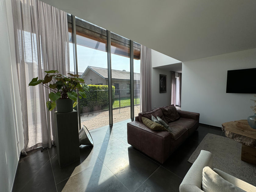 Bij binnenkomst in de woning word je verwelkomd door een ruime entreehal, die je via authentieke Franse paneeldeuren naar de indrukwekkende woonkamer leidt. De woning biedt een open en luchtige indeling van ca 270m², met grote ramen en driedubbel glas die een panoramisch uitzicht op de omliggende natuur bieden. De woonkamer, met een indrukwekkend dakraam met zonwerend glas en een vide, accentueert de helderheid en ruimtelijkheid van de ruimte, waardoor een gevoel van openheid en licht wordt gecreëerd.